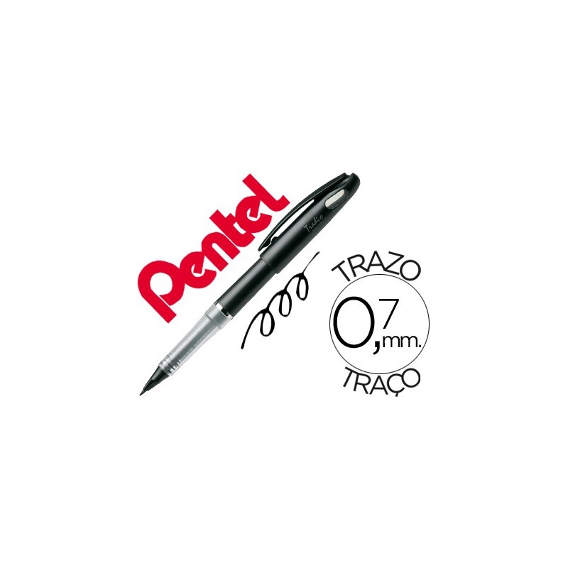 Extremamente elegante com corpo em plástico flexível. Utiliza o inovador sistema Pentel, de tinta capilar que torna a escrita ultra suave até à ultima gota. Possuí uma ponta fina, mas que permite criar uma variedade de larguras de linha, de grosso para f
