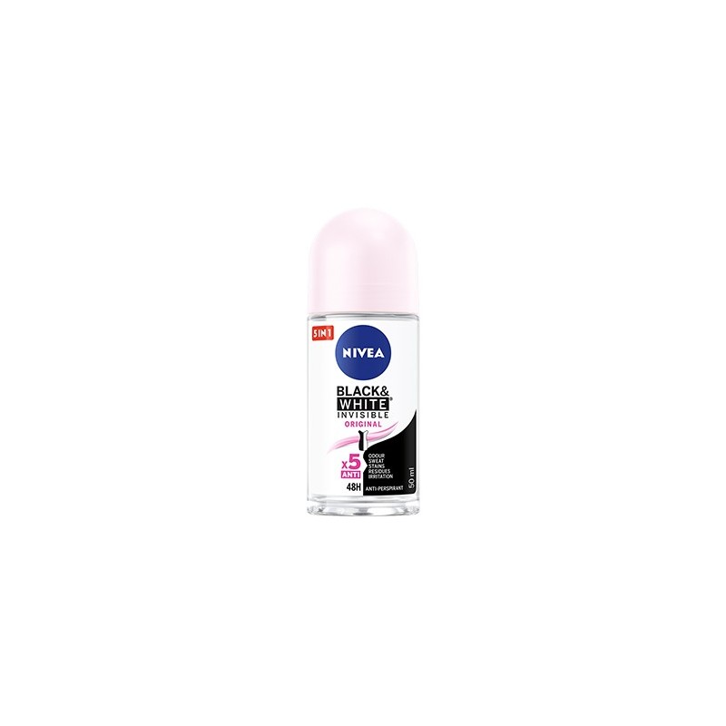 NIVEA Black & White Invisible Original Roll-On para uma eficácia que não deixa manchas brancas na roupa escura e reduz o aparecimento de manchas amarelas na roupa branca. O preto fica preto e o branco fica branco por mais tempo - para que as suas roupas