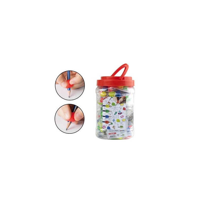 Adaptador de borracha moldado à posição dos dedos. Ideal para uma aprendizagem correcta da posição dos dedos e das mãos na escrita. Pode adaptar-se tanto a esquerdinos como a destros. Recomendado pelos educadores. Cores sortidas. Bolsa de 2 unidades x