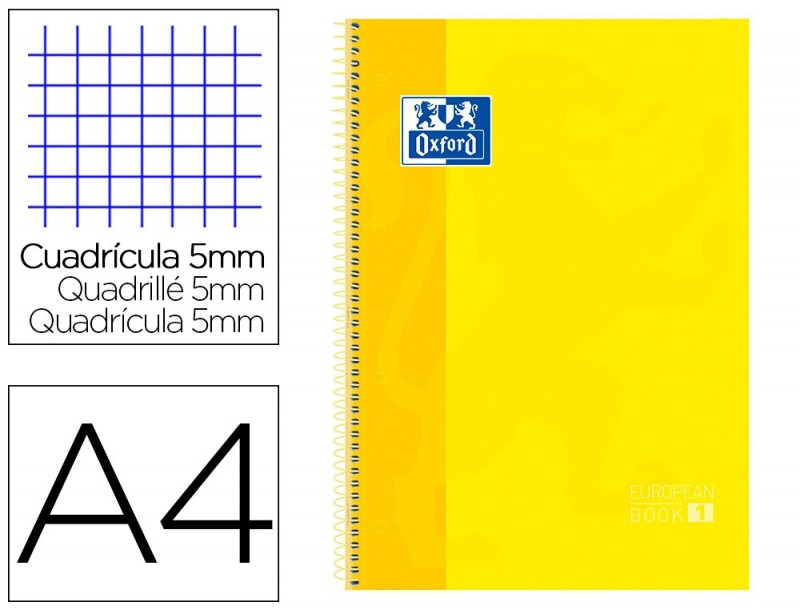 Capa extradura. 80 folhas. Papel de 90 g/m², extra branco e acetinado. 4 furos. Espiral simples a conjugar com a cor da capa. Quadricula de 5 mm. O caderno.