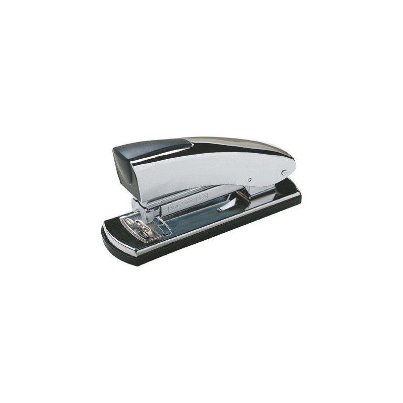 Metálico cromado. Profundidade do agrafado 7,2 cm da margem da folha. Carga 2 pentes (100 agrafes) usa agrafes nº 22/6, 24/6 e 26/6. Com base plástica antideslizante. Com carregador duplo antiobstrução. Incorpora o agrafado PGT (Paper Grip Technology) pa