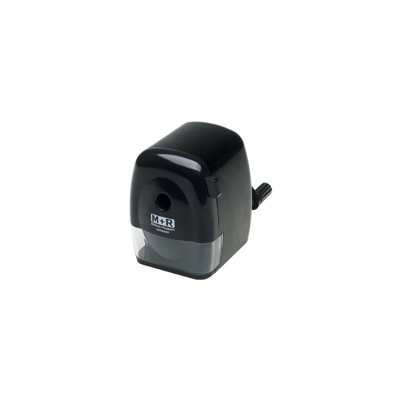 Apara lápis de secretária, manual, com manivela. Braçadeira que evita a rutura. Função de paragem automática. Seleciona o diâmetro da ponta automaticamente. Medidas, 95 x 71 x 110 mm.