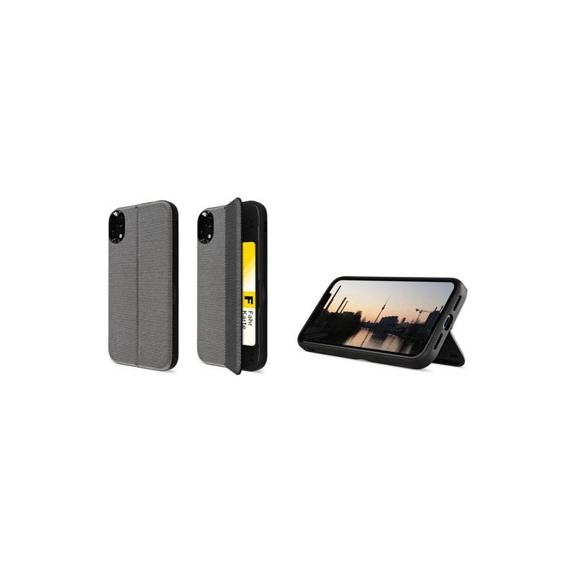 Capa para a traseira do iPhone com funcionalidade de stand. Um segmento da traseira dobra e serve como suporte na posição horizontal; é também a tampa de uma pequeno compartimento onde cabem 2 cartões.