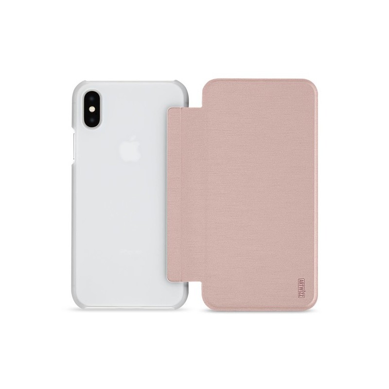 Capa para iPhone X/XS com 2 tipos de materiais, uma parte traseira de encaixe translúcida com toque aborrachado, e uma pala frontal em poliuretano com acabamento metálico escovado e interior revestido a material aveludado.