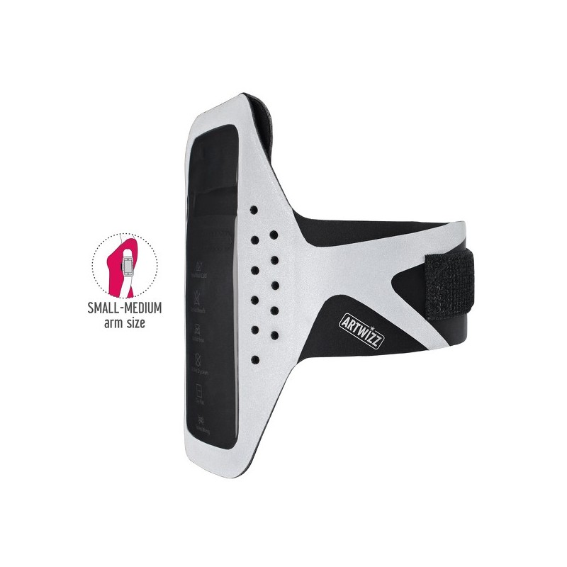 Armband compatível com Smartphones (iPhone 5/5s/SE/5C, Samsung S4 e mini, etc), com um tamanho máximo de 4'' ou 10.16cm na diagonal. Em neoprene com tiras reflectoras na parte frontal, tem fita velcro e é lavável (à mão).