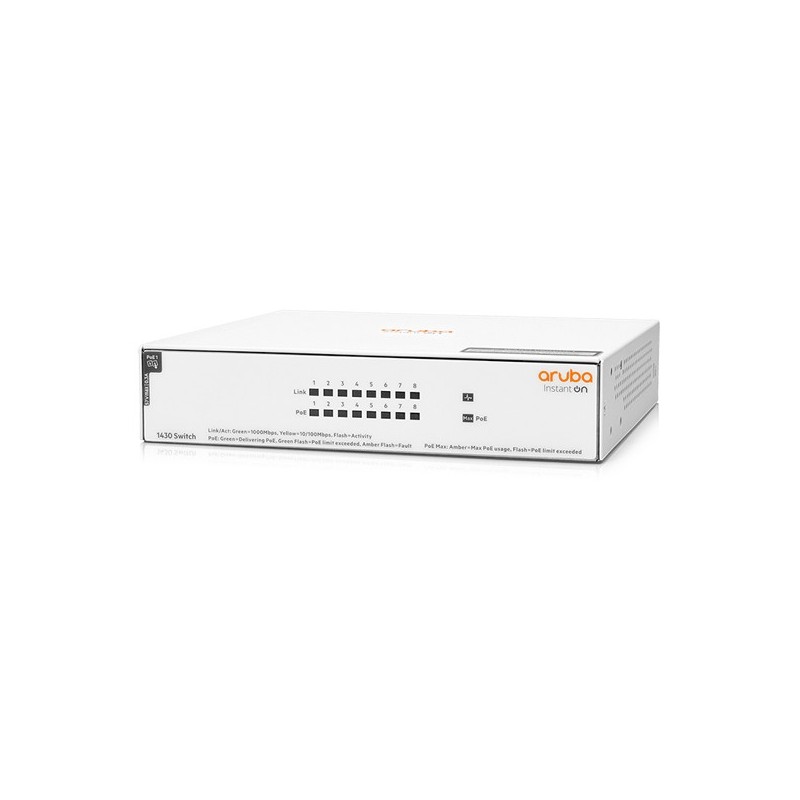 Hewlett Packard Enterprise Aruba Instant On 1430 8G Class4 PoE 64W. Tipo de switch: Não-gerido, Camada de switches: L2. Tipos de portas ethernet Basic switching RJ-45: Gigabit Ethernet (10/100/1000), Número de portas ethernet Basic switching RJ-45: 8. F