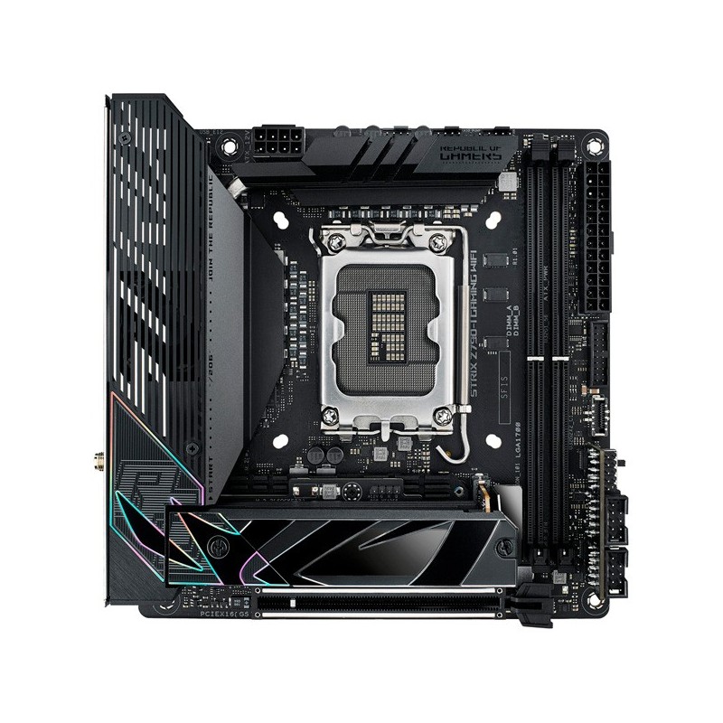 ASUS ROG STRIX Z790-I GAMING WIFI. Fabricante do processador: AMD, Socket do processador: LGA 1700, Processador: Intel Celeron, Intel Core i3, Intel Core i5, IntelCore i7, Intel Core i9,.... Tipos de memórias compatíveis: DDR5-SDRAM, Memória interna