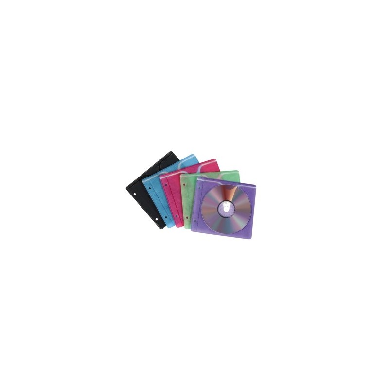 Conjunto de 25 capas coloridas individuais para CD/DVDs em Polietileno translucido, revestido interiomente a papel alcochoado, já furadas para arquivar em pastas ou para transportar. Inclui 5 unidades cada das seguintes cores: azul, roxo, cor de rosa, pr