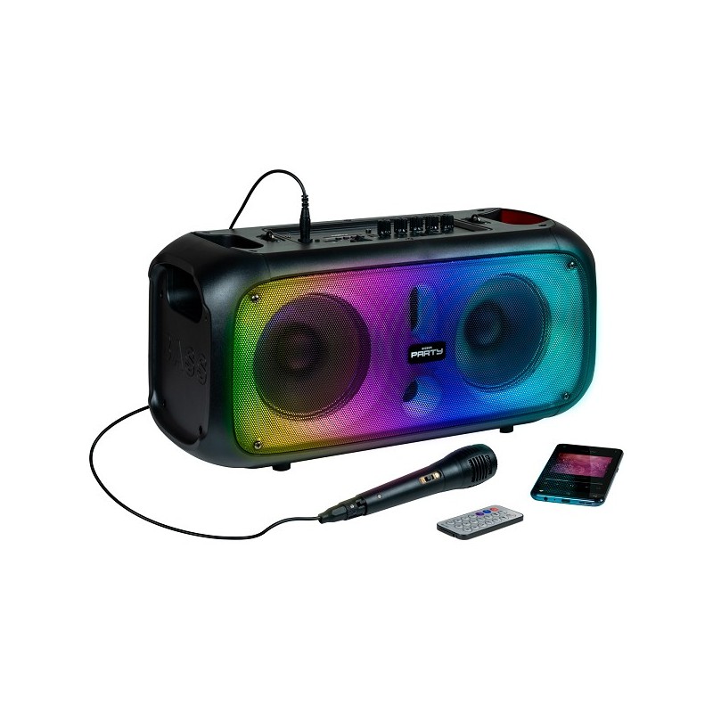 COLUNA DE SOM COM BLUETOOTH E EFEITO DE LUZ - Bluetooth 5.0 - Potência Total de Música: 200 Watts - Vários efeitos de luz LED - Alça de ombro - Microfone com fio incluído. Entrada de microfone de 6,35 mm - Bateria recarregável de 3000 mAh - Leitor USB/Mi