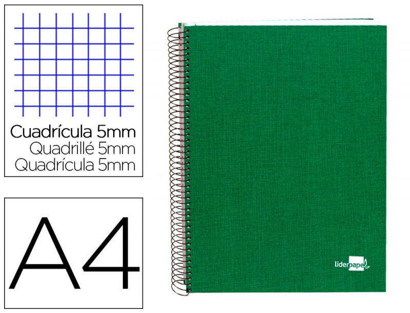 Capa dura de cartão colado de 1,50 mm de espessura, forrado com papel de encadernação plastificado, gofrado tela em P.V.C. Capa interior impressa. Espiral nylonizada preta. 140 folhas. Papel de 80 g/m2 .