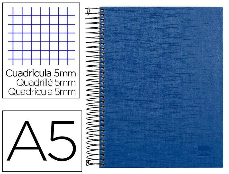 Capa dura de cartão colado de 1,50 mm de espessura, forrado com papel de encadernação plastificado, gofrado tela em P.V.C. Capa interior impressa. Espiral nylonizada preta. 140 folhas. Papel de 80 g/m2 .