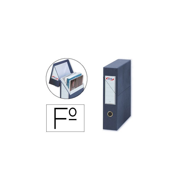Caixa em forma de porta revistas indicada para arquivar. Com duplo estojo interior, com óculo e porta etiquetas. Fabricada em cartão compacto forrado de 2,5 mm de espessura. Medidas: 335 x 250 x 80 mm.
