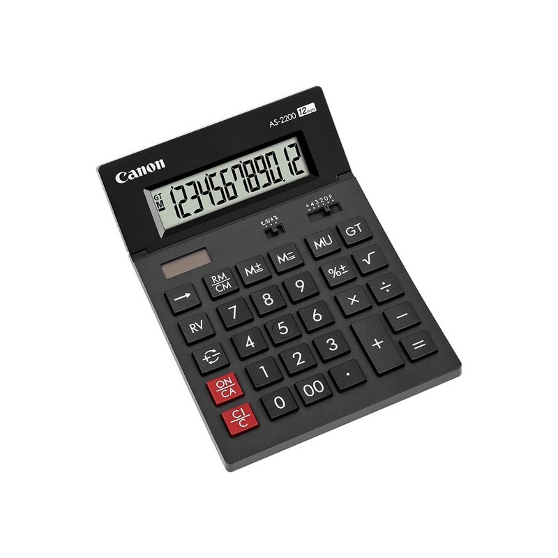 A máquina de calcular Canon AS-2200 de cor preta é ideal para utilização doméstica ou em escritórios profissionais, apresentando estrutura simples e elegante com visor digital de 12 dígitos de inclinação ajustável. Extremamente portátil, esta calculadora