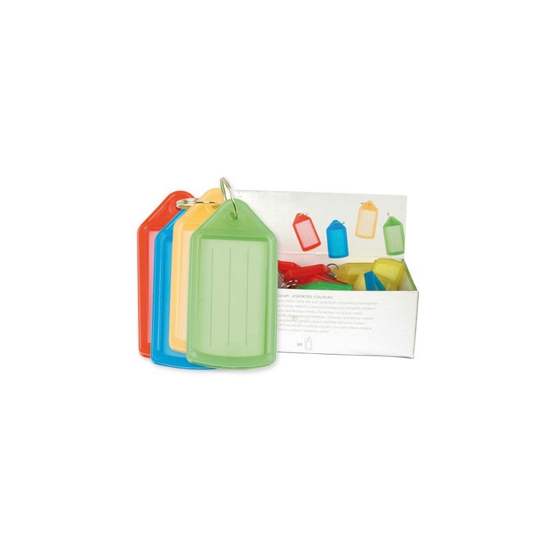 Chaveiros com úteis porta etiquetas para indicar a informação da chave. Etiqueta com linhas. Fabricado em plástico. Cores sortidas. Expositor de 40 unidades. Medidas: 4,5 cm x 2,8 cm.