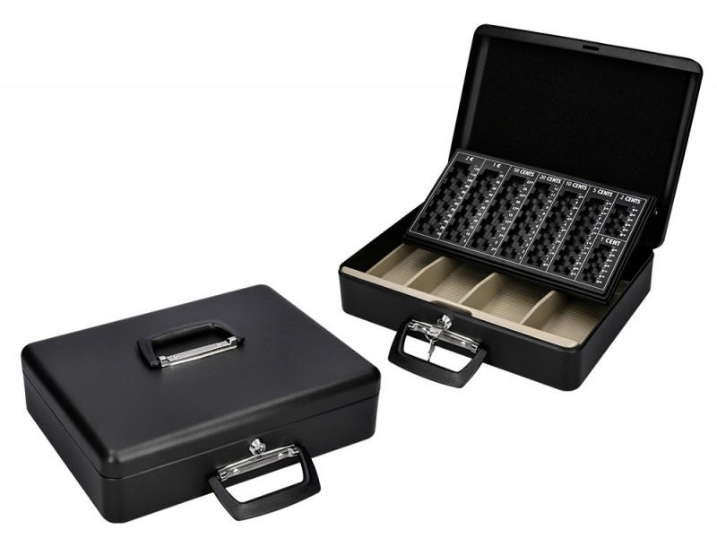 Estrutura de aço de 0,8 mm de espessura. Com classificador para moedas e notas de euro. Inclui 2 jogos de chaves. Medidas: 370 x 110 x 290 mm. Peso: 3,5 kg. A caixa.