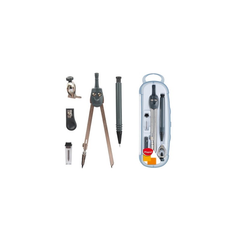 Estojo de compasso Focus com 5 peças. Com hastes de metal. Caixa anti-choque. Contém: 1 compasso, 1 adaptador universal, 1 lapiseira de 0,5 mm, 1 afia minas e 1 estojo de minas. Comprimento: 13 cm. Circunferência: 37 cm.