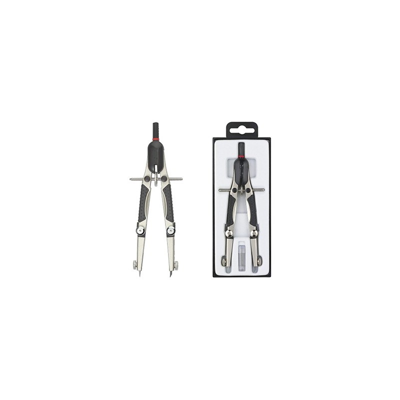 Compasso micrométrico com configuração exata do raio. Abertura e fecho simultâneos com ambos braços. Alta resistência a alterações fortuitas no raio. Uso cómodo graças ao agarre de plástico com pontos. Tubo de minas e agulha de recarga. Comprimento: 17 c
