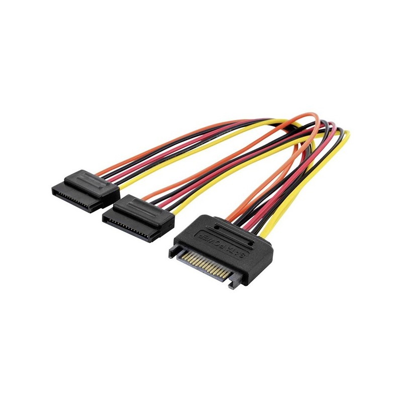 SATA 15-pin, plug <=> 2x SATA 15-pin, jack Connector 1: SATA 15-pin plug Connector 2: 2x SATA 15-pin jack Hoods: plastic Shielding: Unshielded AWG: 18 Wire material: CU Color cable: various Color connector: black Length: 0.