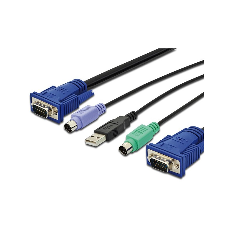 Digitus DS-19232. Comprimento do cabo: 3 m, Cor da caixa: Multi cor, Preto, Revestimento dos contactos do conetor: Níquel. Entrada de consola: USB, Tipo de porta de teclado: PS/2, Tipo de porta de rato: PS/2. Comprimento: 3 m