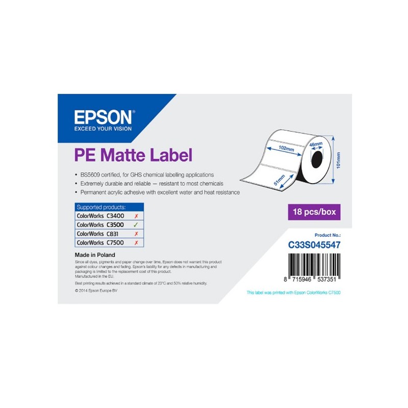 Epson PE Matte Label. Tipo de etiqueta: PE, Tipo de acabamento: Fosco, Certificação: BS 5609. Comprimento da etiqueta: 10,2 cm, Altura da etiqueta: 5,1 cm. Quantidade por conjunto: 1 unidade(s), Comprimento da embalagem: 113 mm, Profundidade da embalagem