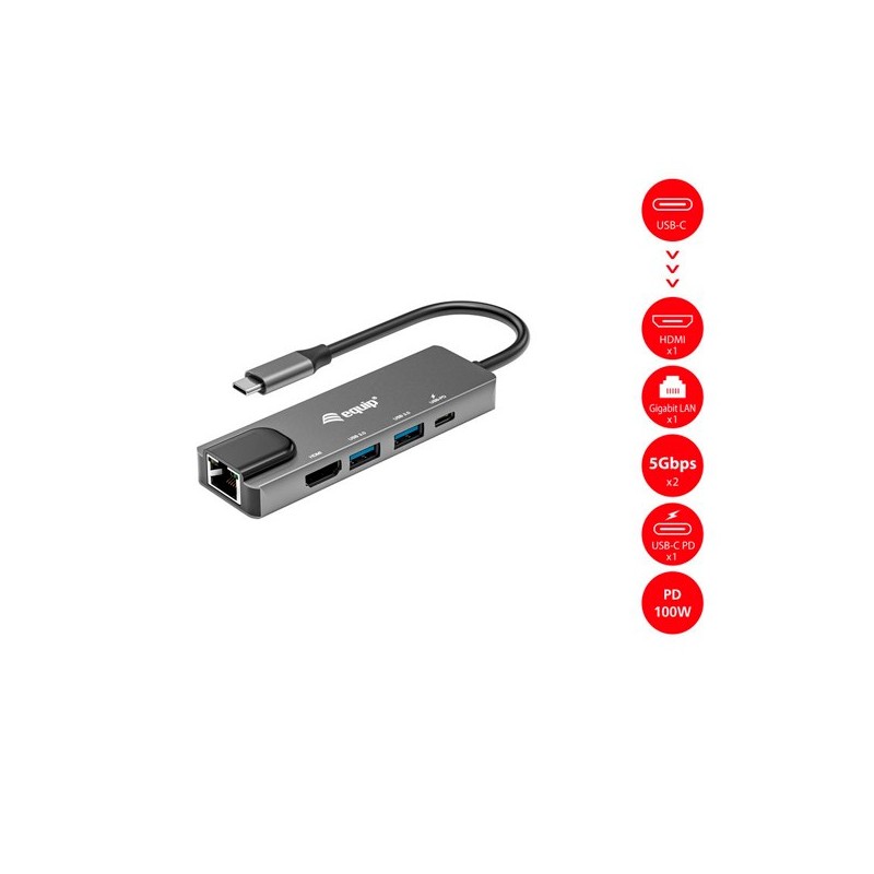 Equip 133489. Tecnologia de conetividade: Com fios, Interface do host: USB 3.2 Gen 1 (3.1 Gen 1) Type-C, Fornecimento de energia USB até: 100 W. Taxa de transferência de dados Ethernet LAN: 10,100,1000 Mbit/s. Cor do produto: Cinzento, Taxa de transferên