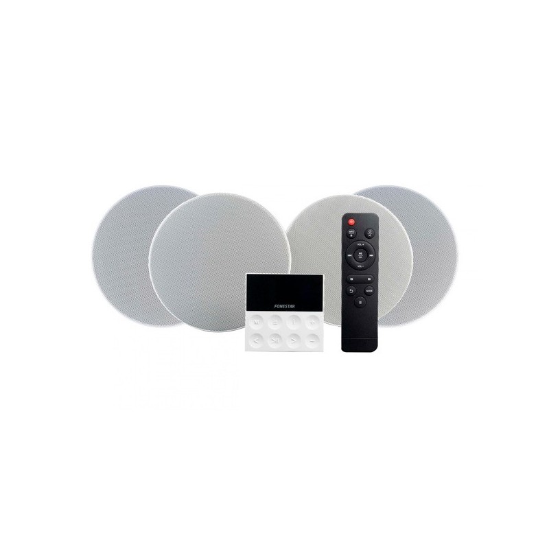 Kit de som (tudo em um) que inclui 4 colunas de teto e amplificador de parede. Com múltiplas opões de reprodução: Bluetooth®/USB, sintonizador FM com 50 pré-sintonias e duas entradas auxiliares, ampliando as suas possibilidades e permitindo desfrutar da