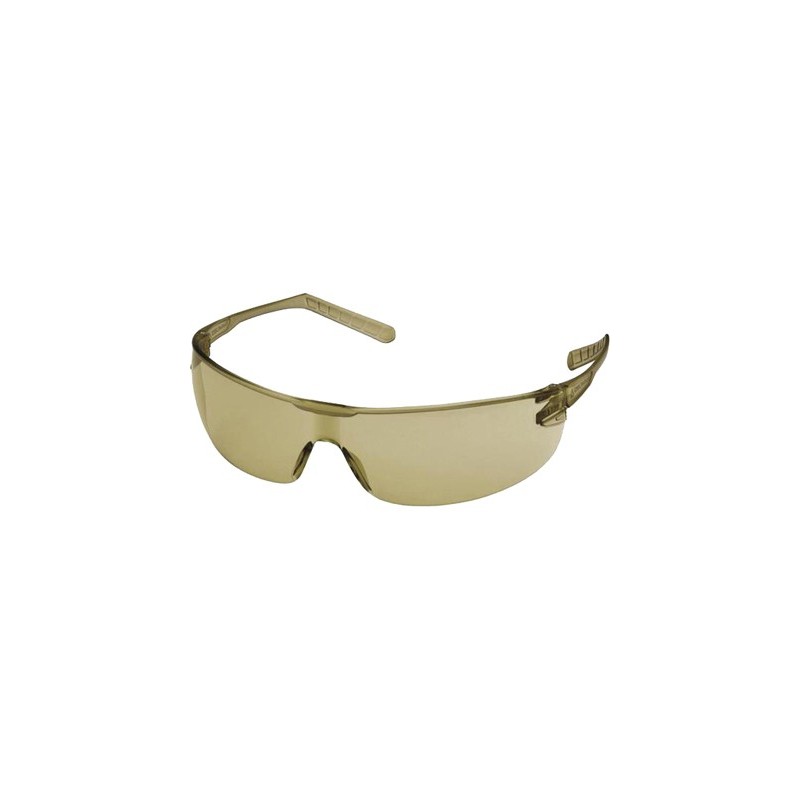Óculos de policarbonato, monobloco ultra leve. Extra fino. Adaptados para um uso de longa duração. Ocular com filtragem de luz azul de 65% para proteger os olhos contra radiação prejudicial dos visores. Cor castanha.