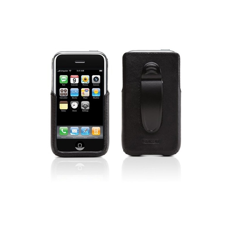 Bolsa em cabedal de cor preta onde o iPhone 1G encaixa, mantém o ecrã sempre à vista. Inclui uma película de protecção de ecrã e pano de limpeza, tem clip para cinto rotacionável 180°.