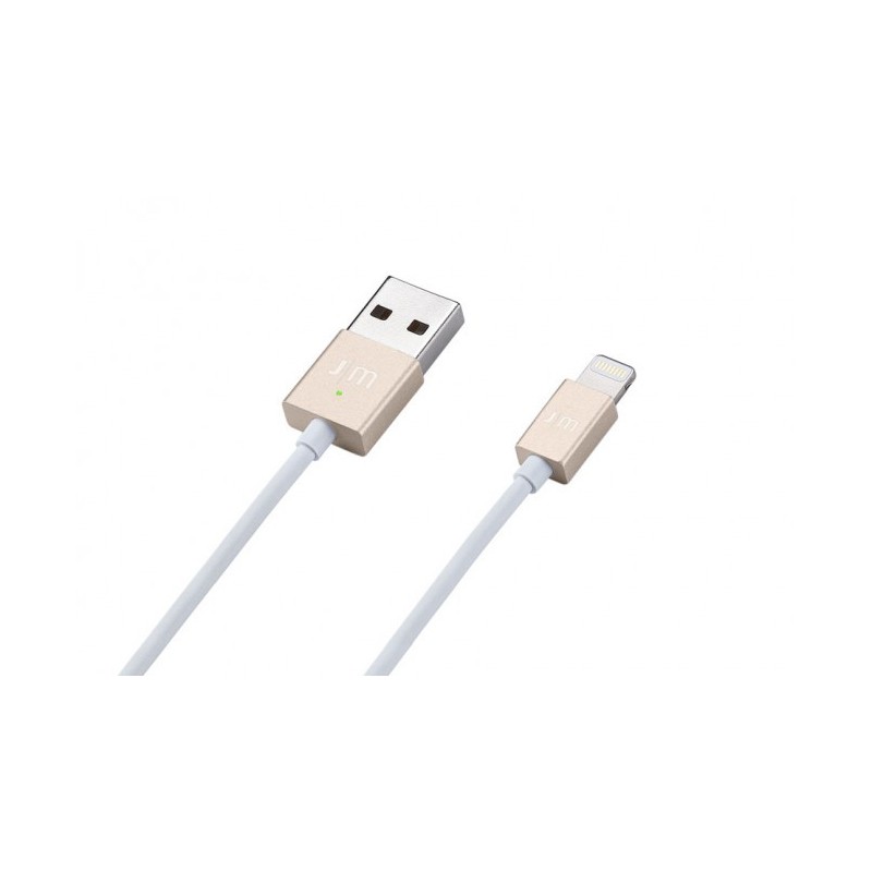 Cabo USB-Lightning com pontas em alumínio, tem uma luz LED que proporciona informação sobre o estado do carregamento de um iPad, iPhone ou iPod: pulsa a cor laranja quando está a carregar, fica de cor verde quando a bateria está na capacidade completa.