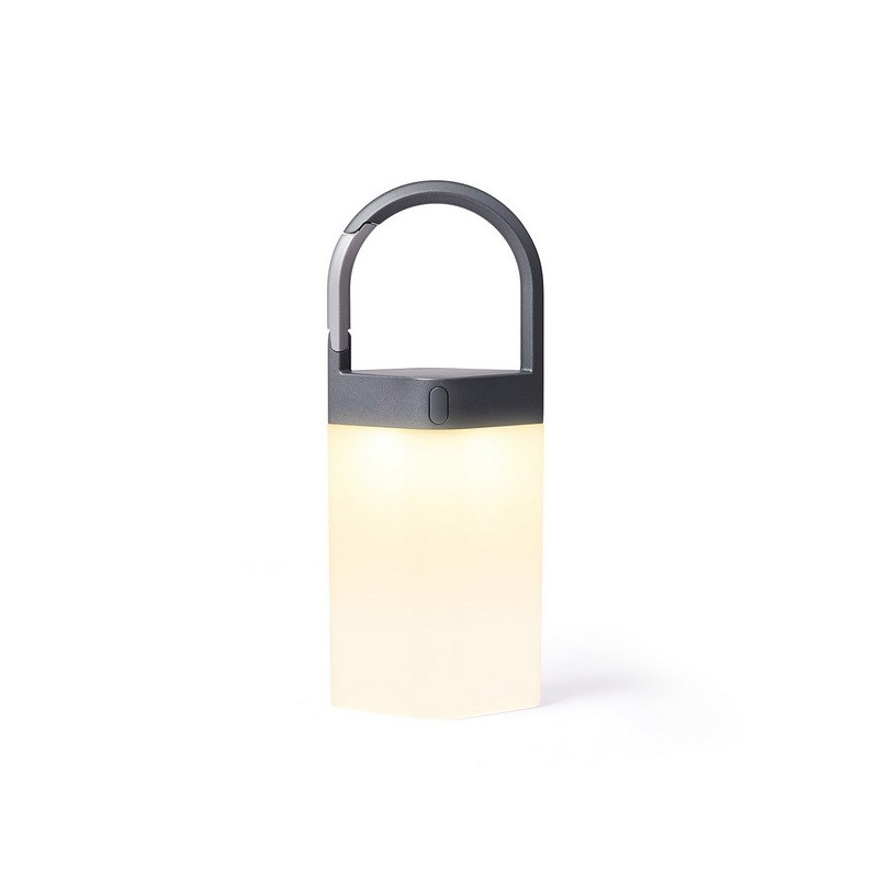 Candeeiro em alumínio e ABS para exterior, portátil, no topo tem um mosquetão incorporado na pega. Tem resistência à agua IPX4, bateria com autonomia para 12 hrs funcionamento e recarregável por USB-C. Pode-se optar por luz branca quente ou fria, ou uma