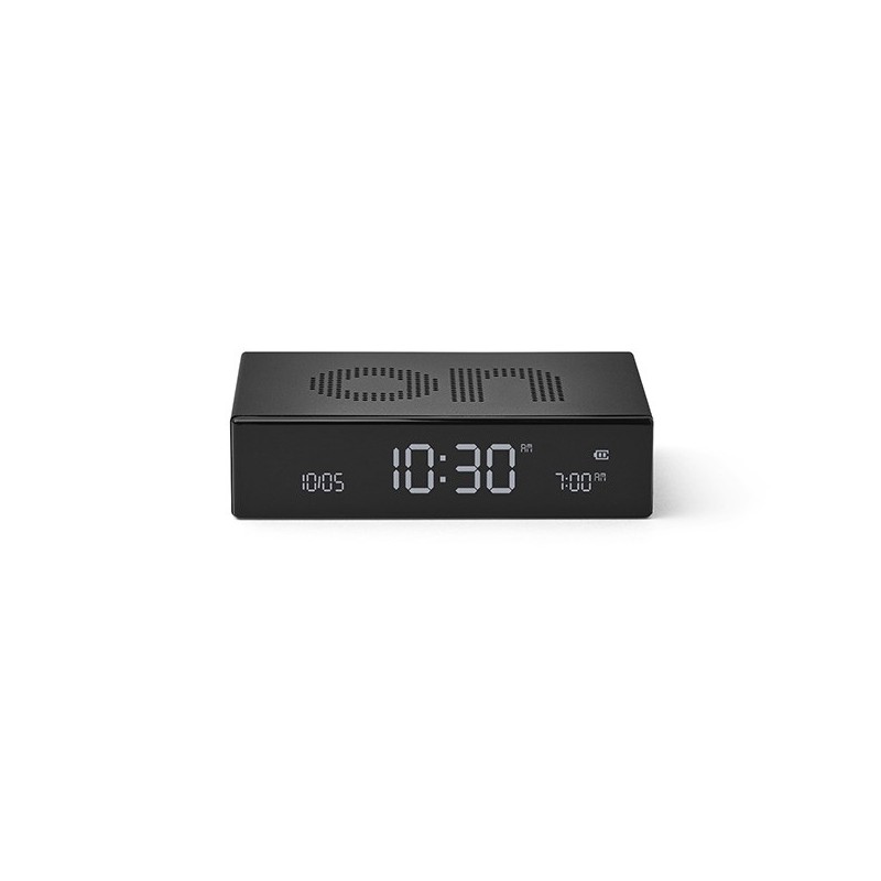 Relógio despertador em alumínio com base/topo reversível, fica desligado se face OFF para cima, e com despertador activado se ON. Tem ecrã LCD, botão travão para viagem, comando táctil para desligar alarme sonoro, inclui cabo para carregamento por USB-C