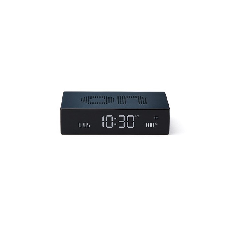 Relógio despertador em alumínio com base/topo reversível, fica desligado se face OFF para cima, e com despertador activado se ON. Tem ecrã LCD, botão travão para viagem, comando táctil para desligar alarme sonoro, inclui cabo para carregamento por USB-C