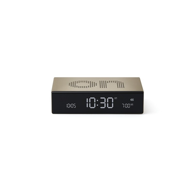 Relógio despertador em alumínio com base/topo reversível, fica desligado se face OFF para cima, e com despertador activado se ON. Tem ecrã LCD, botão travão para viagem, comando táctil para desligar alarme sonoro, inclui cabo para carregamento por USB-C