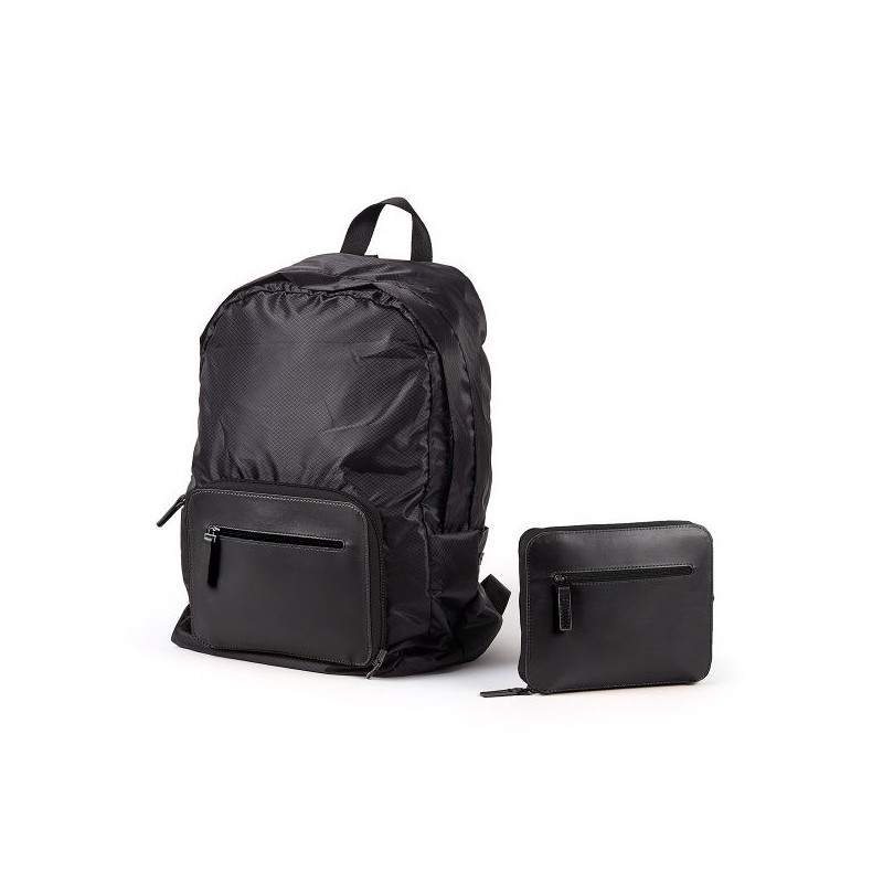 Mochila em tecido leve de Nylon, que arruma numa bolsa em cabedal PU com zip, com dimensão 15 x 18.5 x 1.4cm. Ideal para levar em viagem, proporciona espaço de arrumação extra em caso de necessidade. Tem fita para encaixar num trolley, capacidade 14L.