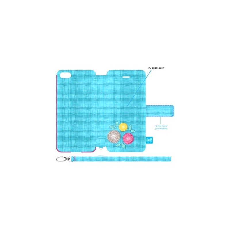 Capa tipo agenda para iPhone 5/5s/SE, com encaixe rigido para o telefone, exterior em tecido com padrão ''Anna'' e interior em rosa fuscia. Tem fecho magnético.