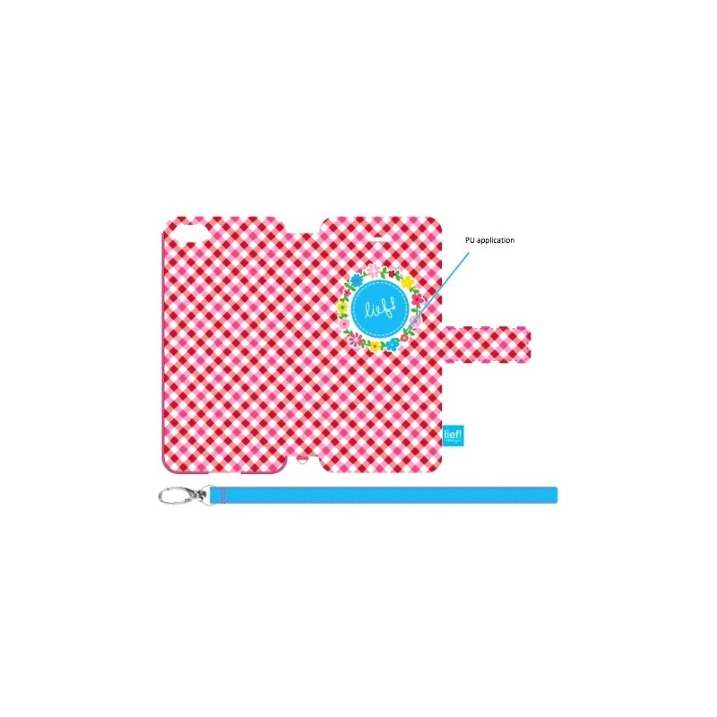 Capa tipo agenda para iPhone 5/5s/SE, com encaixe rigido para o telefone, exterior em tecido com padrão ''Tess'' e interior em rosa fuscia. Tem fecho magnético.