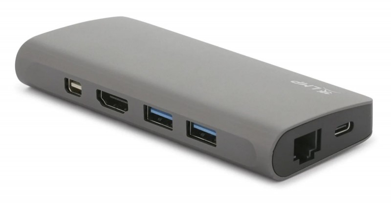 Hub USB-C com 9 portas: 1x HDMI 4K@60Hz, 1x mini-DisplayPort 4K@60Hz, 1x VGA (1080p@60Hz), 2x USB, 1x USB-C PD (100W), 1x Gigabit ethernet, 1x micro SD e 1x SD. O cabo USB-C de ligação ao Mac/PC pode ser arrumado na base do hub, inclui bolsa.