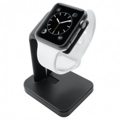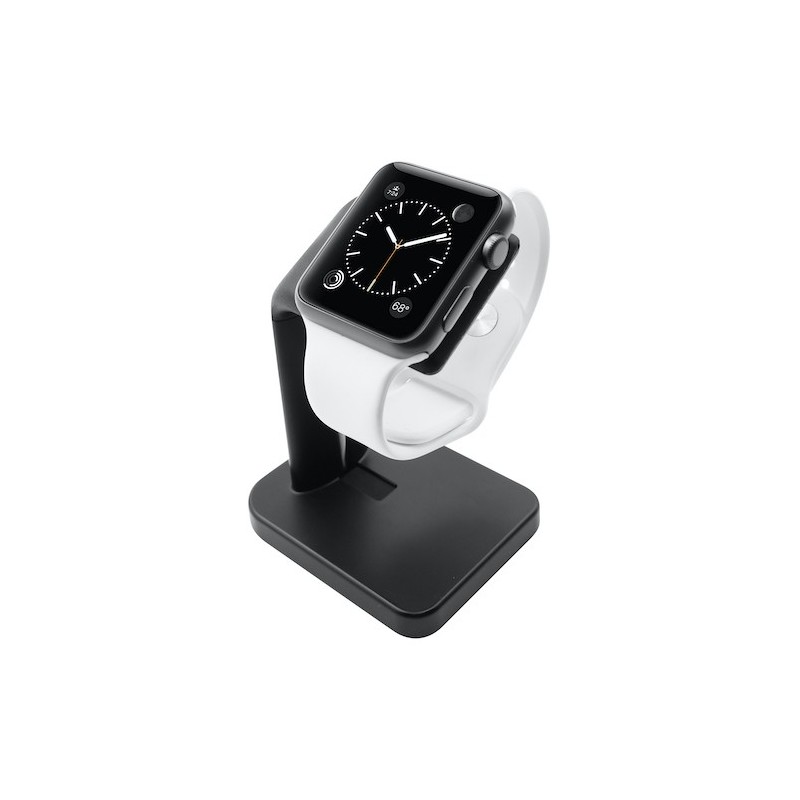 Stand para Apple Watch em metal com partes em silicone/borracha. Requer a utilização do cabo de carregamento original do Apple Watch para carregar, que fica escondido numa ranhura na base e lateral do stand.