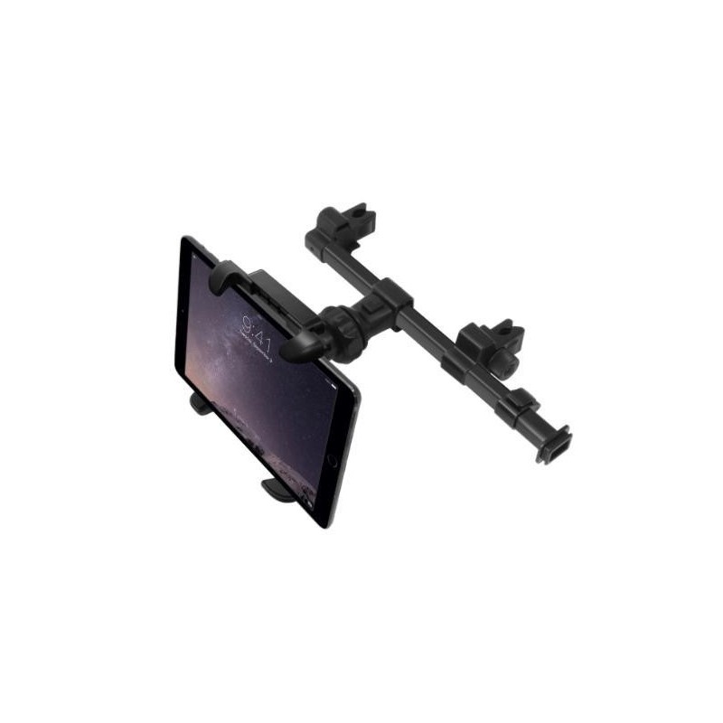 Suporte para suspender um iPad/tablet até 10'' nas traseiras dos ferros do encosto de cabeça da cadeira de um carro, ideal para visionar filmes no banco de trás. A barra de suporte permite a instalação entre as duas cadeiras, para ficar ao centro e visív