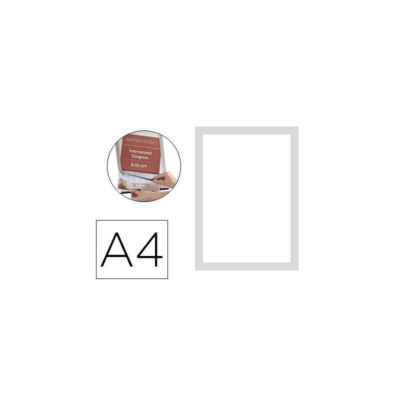 Moldura porta anúncios com prático sistema magnético para a introdução cómoda e rápida de documentos. Para fixar em superfícies lisas graças ao dorso adesivo removível. Permite o uso vertical e horizontal. Formato Din A4. Pack de 2 molduras.