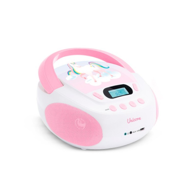 O universo do CD player Unicórnio, com seu unicórnio, vai agradar a todas as crianças e vai fazê-las viajar em um ambiente mágico e colorido. Seu design exclusivo se encaixa perfeitamente no quarto de uma criança. Ele funciona com rede elétrica e bateria