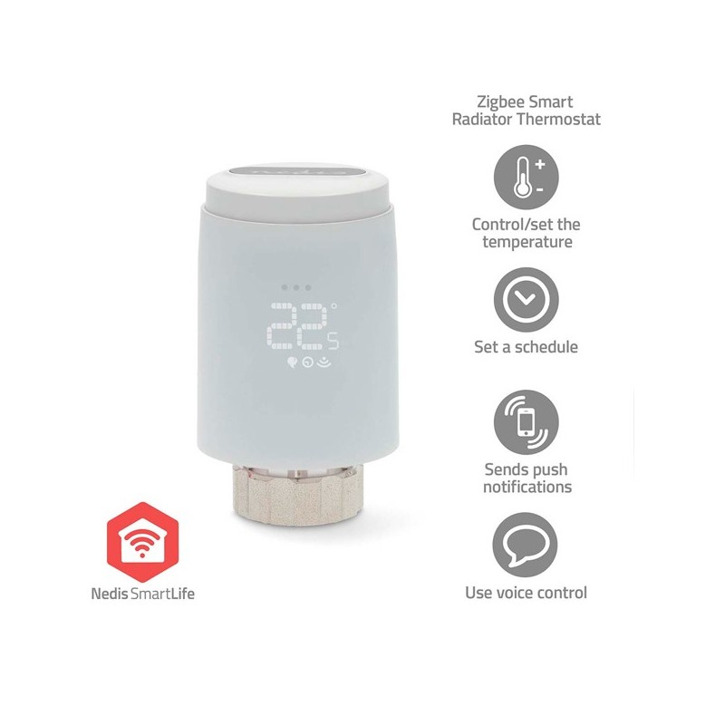 Termostato de radiador Smart Zigbee para controlar a temperatura em qualquer cômodo da sua casa• Defina um horário ou altere a temperatura remotamente com o aplicativo Nedis® Smartlife no seu smartphone ou tablet• Com um display LED integrado e o botão i