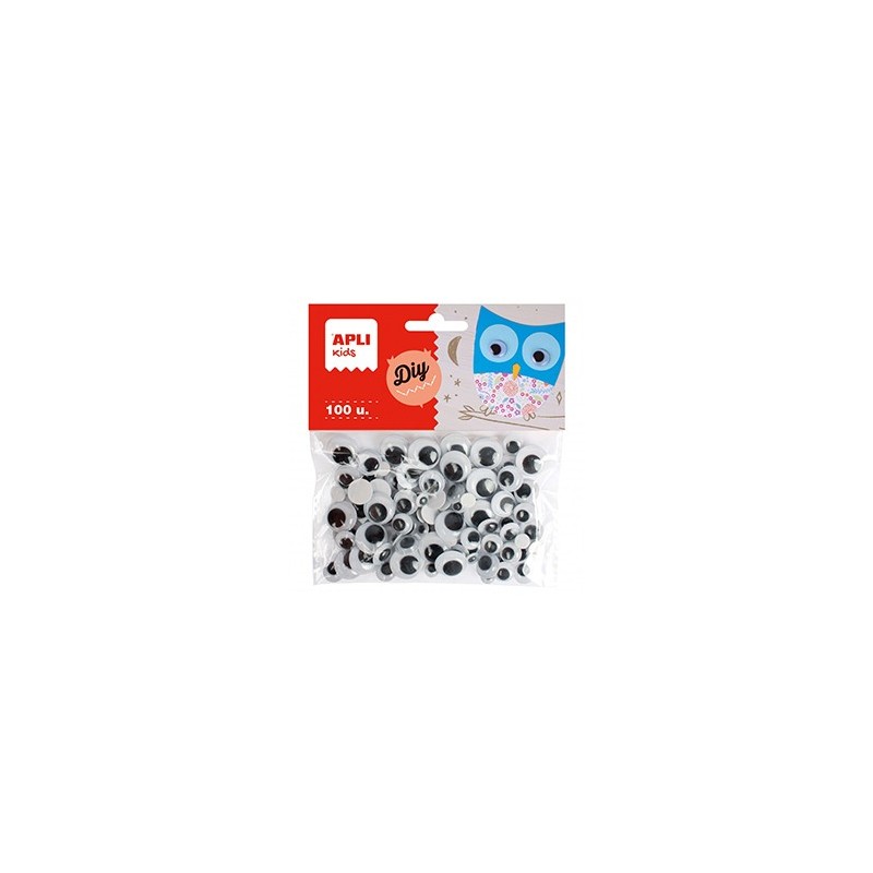Olhos móveis com adesivo na parte de trás, prontos para usar. Forte poder adesivo em muitas superfícies: papel, papelão, espuma EVA, plástico, cerâmica ou vidro. Produto básico para escolas e oficinas infantis, ideal para agregar em desenhos, fantoches o
