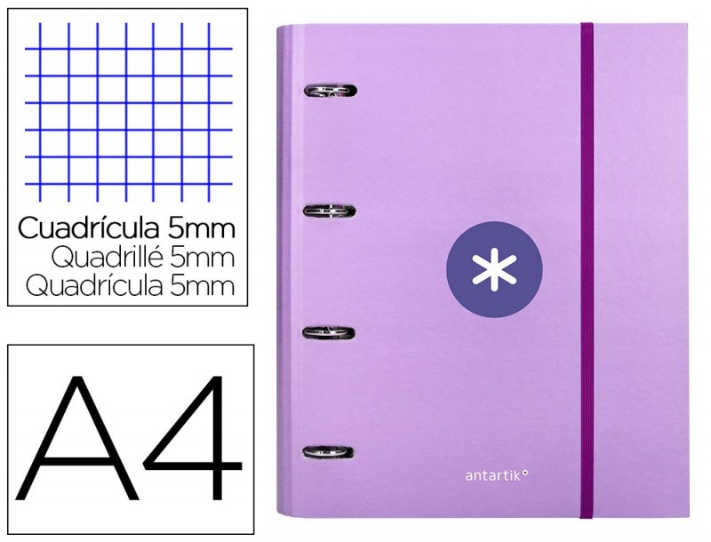 Capa de cartão forrado de 1,5 mm de espessura. 4 anéis redondos de 25 mm. Fecho de elástico. Com ranhuras para anéis. 100 folhas com 5 bandas de cor. Papel interior extra branco de 100 g/m2. Ultrasuave. Quadrícula de 5 mm. Din A4. Guarda interior impress