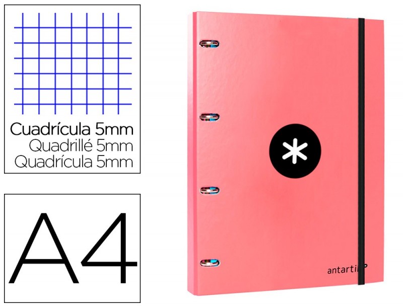 Capa de cartão forrado de 1,5 mm de espessura. 4 anéis redondos de 25 mm. Fecho de elástico. Com ranhuras para anéis. 100 folhas com 5 bandas de cor. Papel interior extra branco de 100 g/m2. Ultrasuave. Quadrícula de 5 mm. Din A4. Guarda interior impress