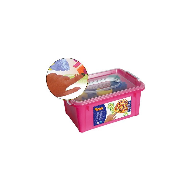 Caixa de pintura a dedos que contém: 6 frascos de cores de 125 ml (amarelo, azul, branco, castanho, vermelho e verde), 4 esponjas, 4 templates e 1 rolo. O conjunto.