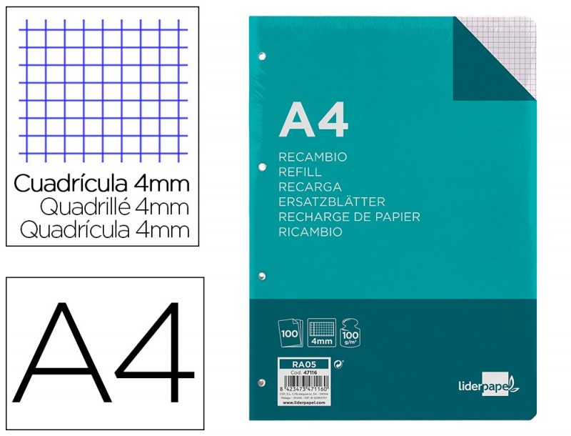 fiber_manual_record Adicionar à Wishlist Avaliação(0) RECARGA LIDERPAPEL A4 200+50 FOLHAS 90 GR QUADRICULA 5 MM 4 7,76 €6.31 s/Iva.Preço