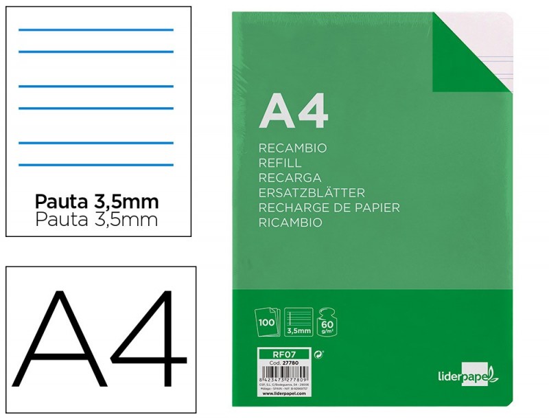 fiber_manual_record Adicionar à Wishlist Avaliação(0) RECAMBIO LIDERPAPEL CUARTO 100 H CUADRICULADO PAUTADO 4 MM 6 2,41 €1.96 s/Iva.Preço