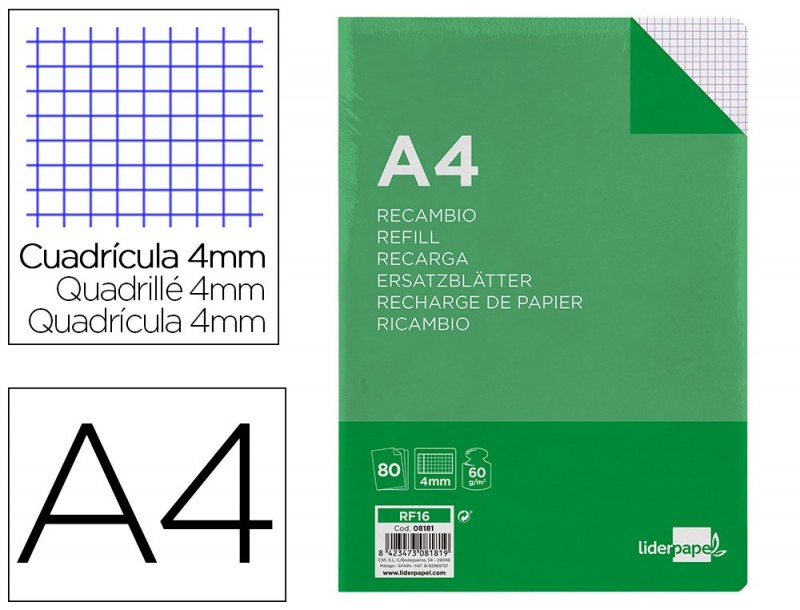 fiber_manual_record Adicionar à Wishlist Avaliação(0) RECARGA LIDERPAPEL A4 200+50 FOLHAS 90 GR QUADRICULA 5 MM 4 7,76 €6.31 s/Iva.Preço