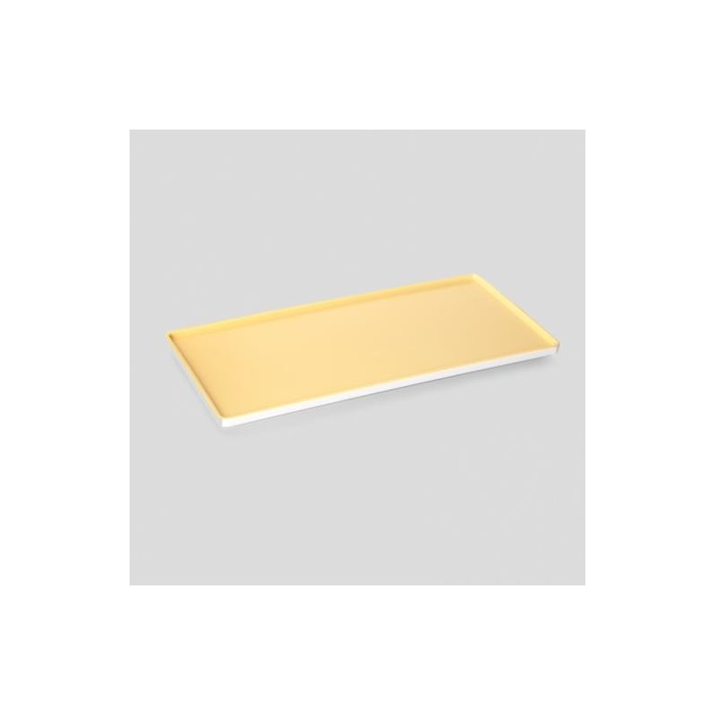 Tabuleiro em melamine com dimensões 321 x 160 x 13 mm. Cumpre os requisitos de segurança para contacto com comida, mas pode ser usado em múltiplos ambientes e funções.